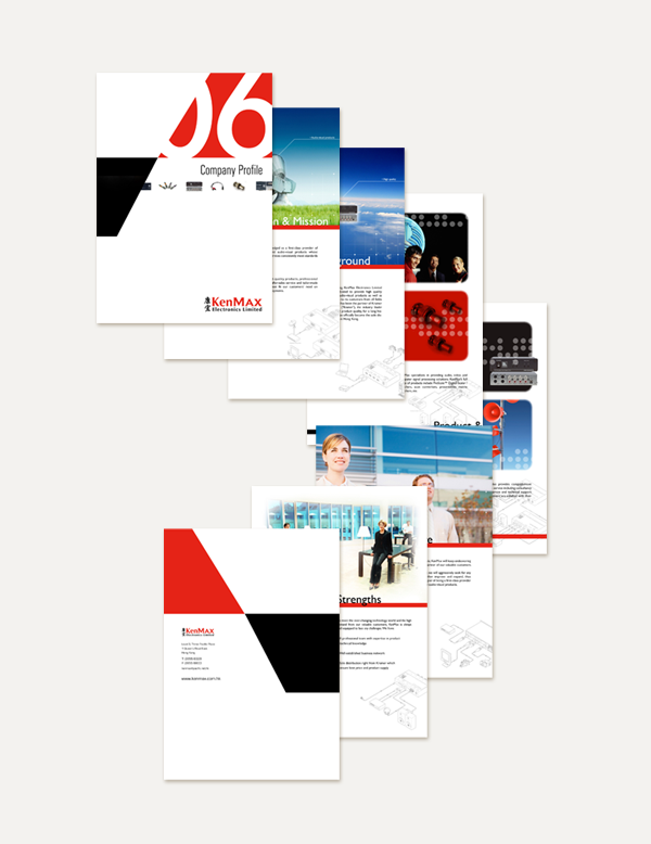As an electronic product company which sells equipments to help businesses in delivering valuable messages to their customer, I used the solid red and black lines to represent the connection between them. The same design element is used in the whole brand design, including brochure, name card and website. This is done to enforce the image.