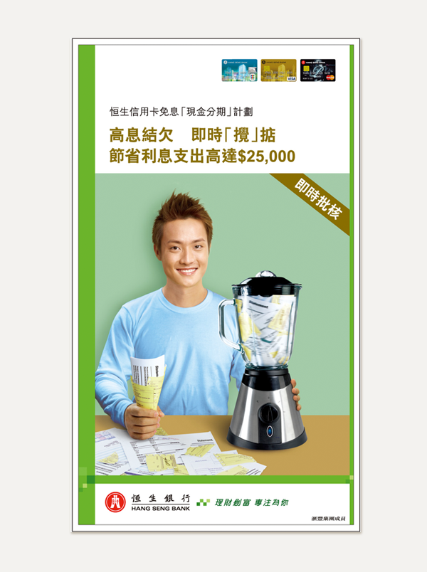 It is an ad about low interest credit card loan for tax payment. The chinese tag line said that the bank could fix your tax and high interest payment problem immediately. The blender matches what was said in the chinese tag line, which use the chinese word "mix" to produce the "solution". Using Photoshop, I have combined at least seven different stock photos in photoshop to produce the final image.