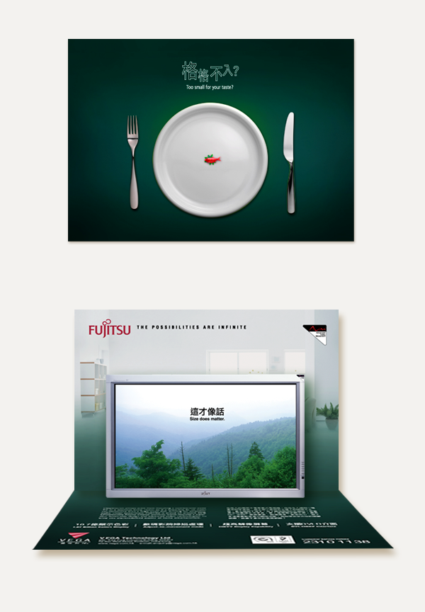 The purpose of this direct mail is though a sense of humor and illogical appearance to persuade high income potential customer to buy a large TV in their home. I used a image of a small meal in a large dish to produce an illogical appearance to attract people's attention, making them aware and perceive that a large living room needs a large TV for visual matching.