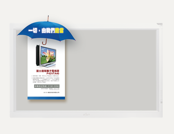 To sell the additional TV insurance plan, a custom popup was printed and sticked to the surface of the TV in-store for the attraction of customers' attention. To project a safety image, an umbrella popup was placed on the TV, and the chinese text "We will handle anything" was printed on it.